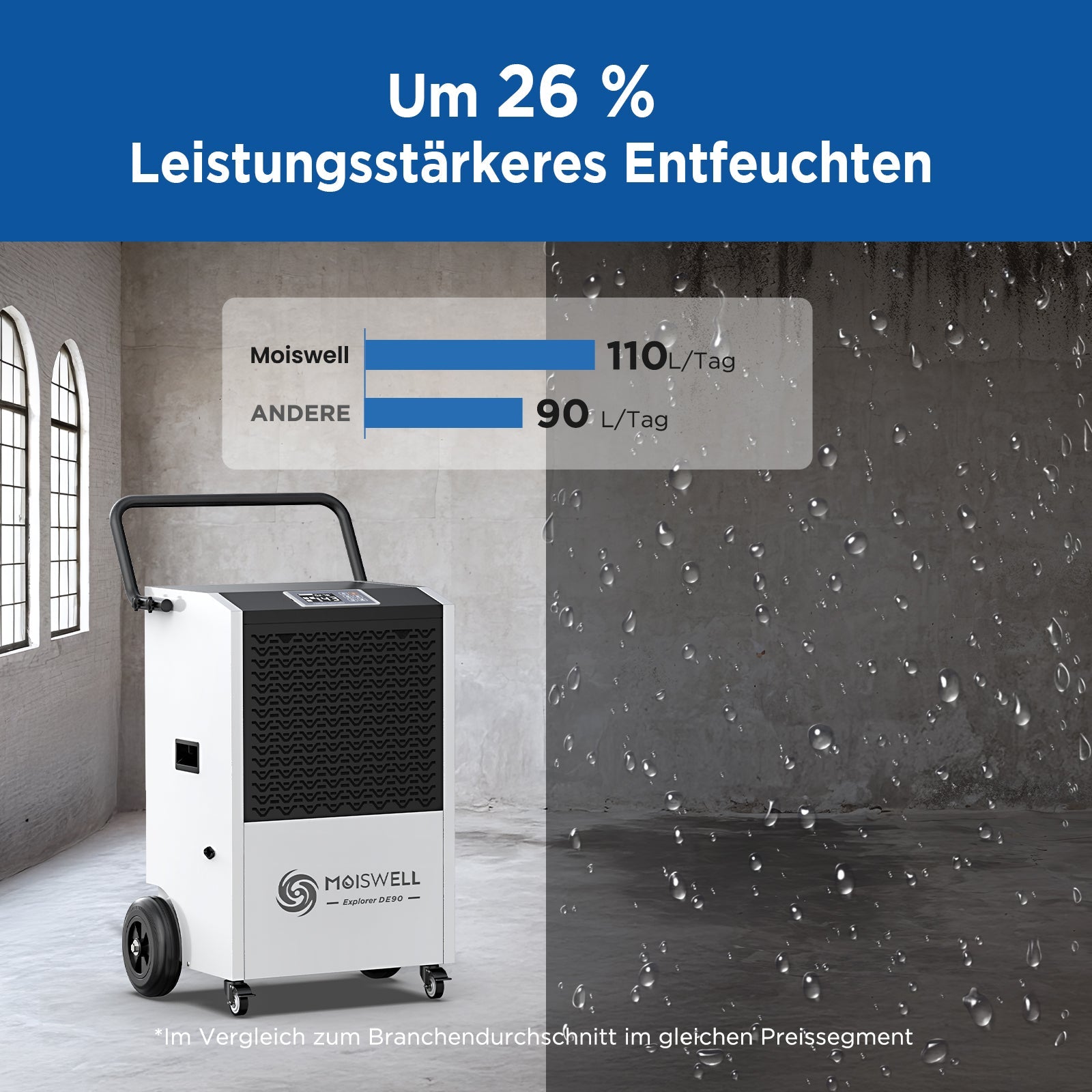 Hohe Entfeuchtungsleistung: Bis zu 110 Liter/Tag (90 PPD nach 30℃ 80%RH). Entfernt effizient Feuchtigkeit aus der Luft – ideal für große, feuchte Gewerberäume wie Keller, Lagerhallen, Fitnessstudios, Hallenbäder und Spa-Bereiche.