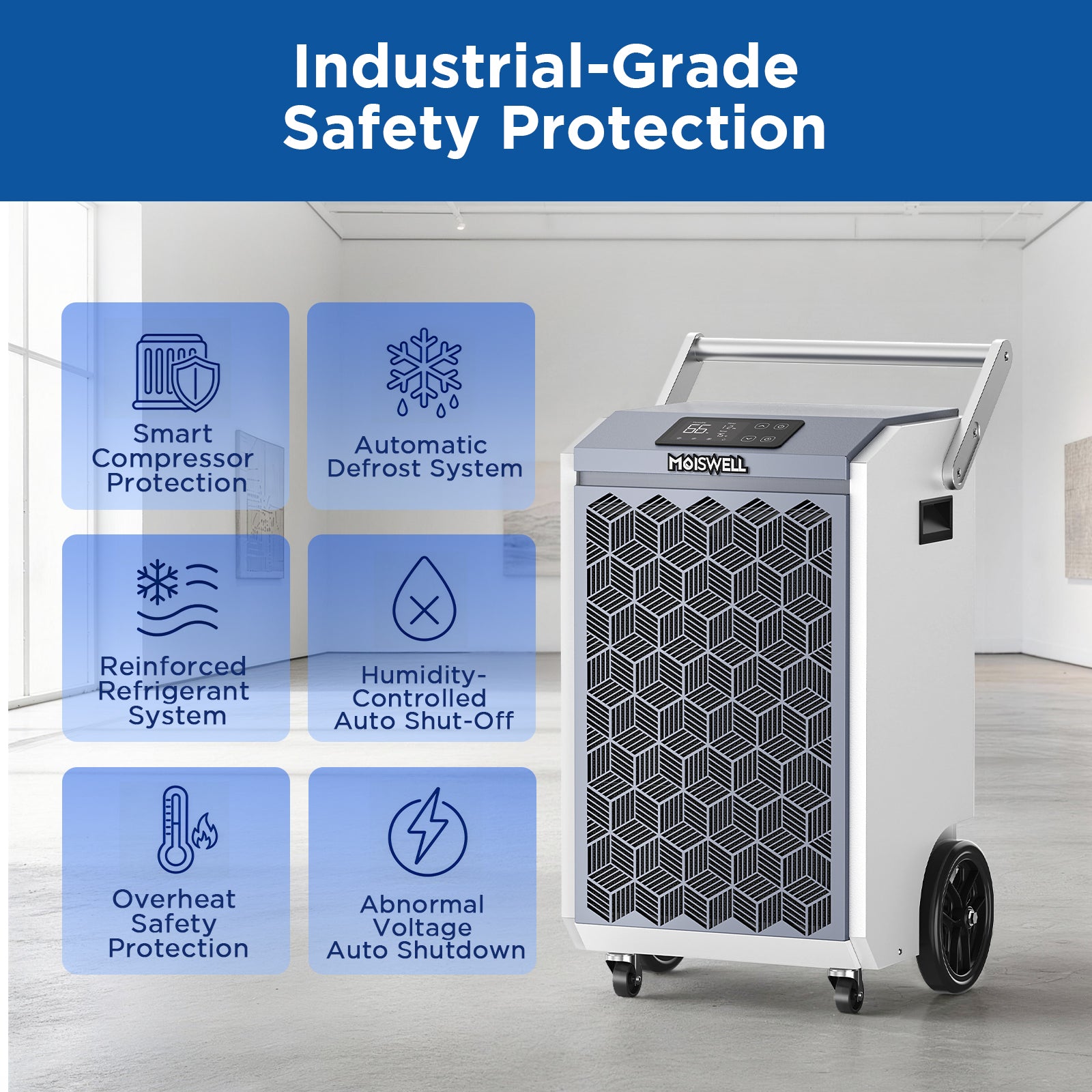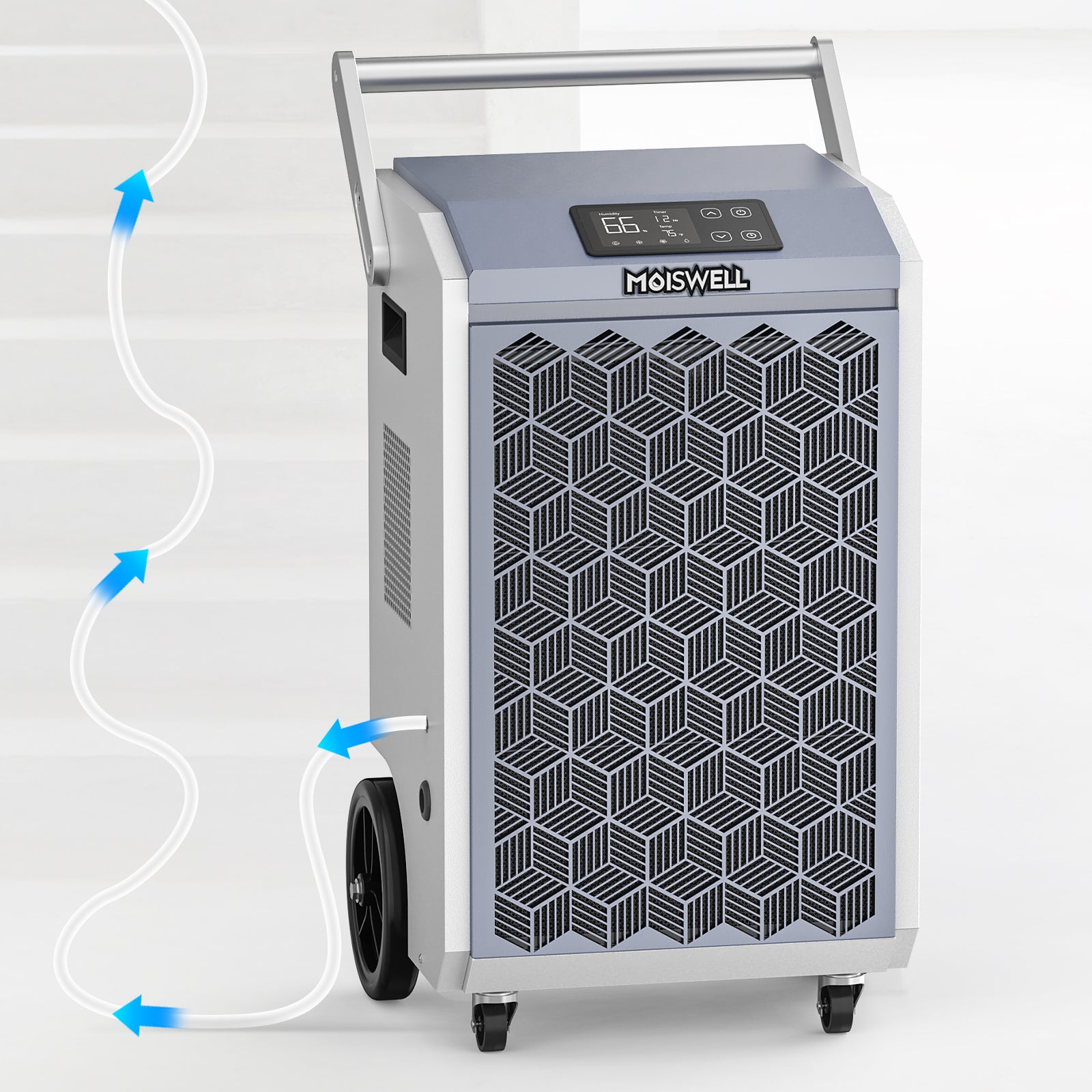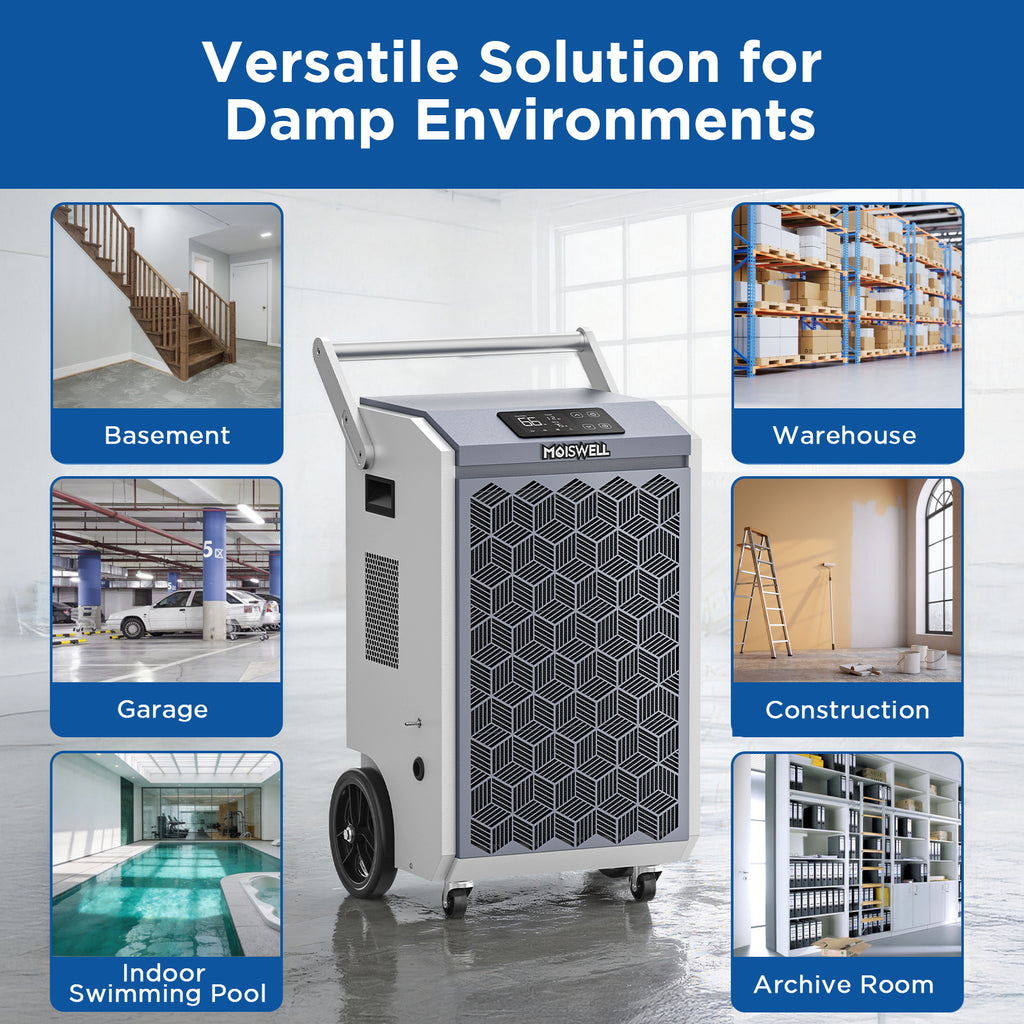 Moiswell commercial dehumidifier removes up to 200 pints/day (90 pints AHAM), ideal for basements, garages, warehouses, gyms, and more. With 320 CFM airflow, it quickly pulls out deep moisture—perfect for restoration and drying jobs. Reliable humidity control wherever you need it.