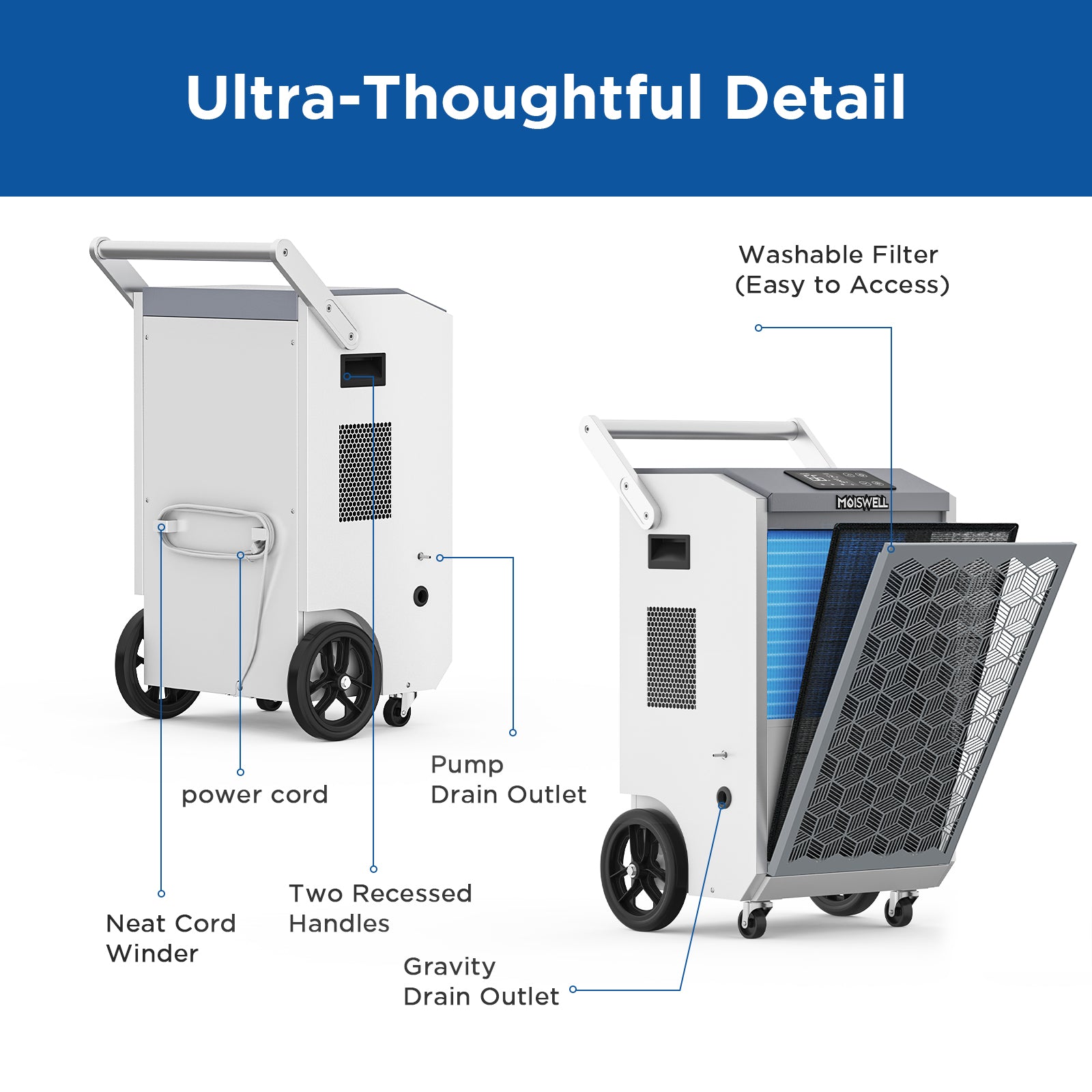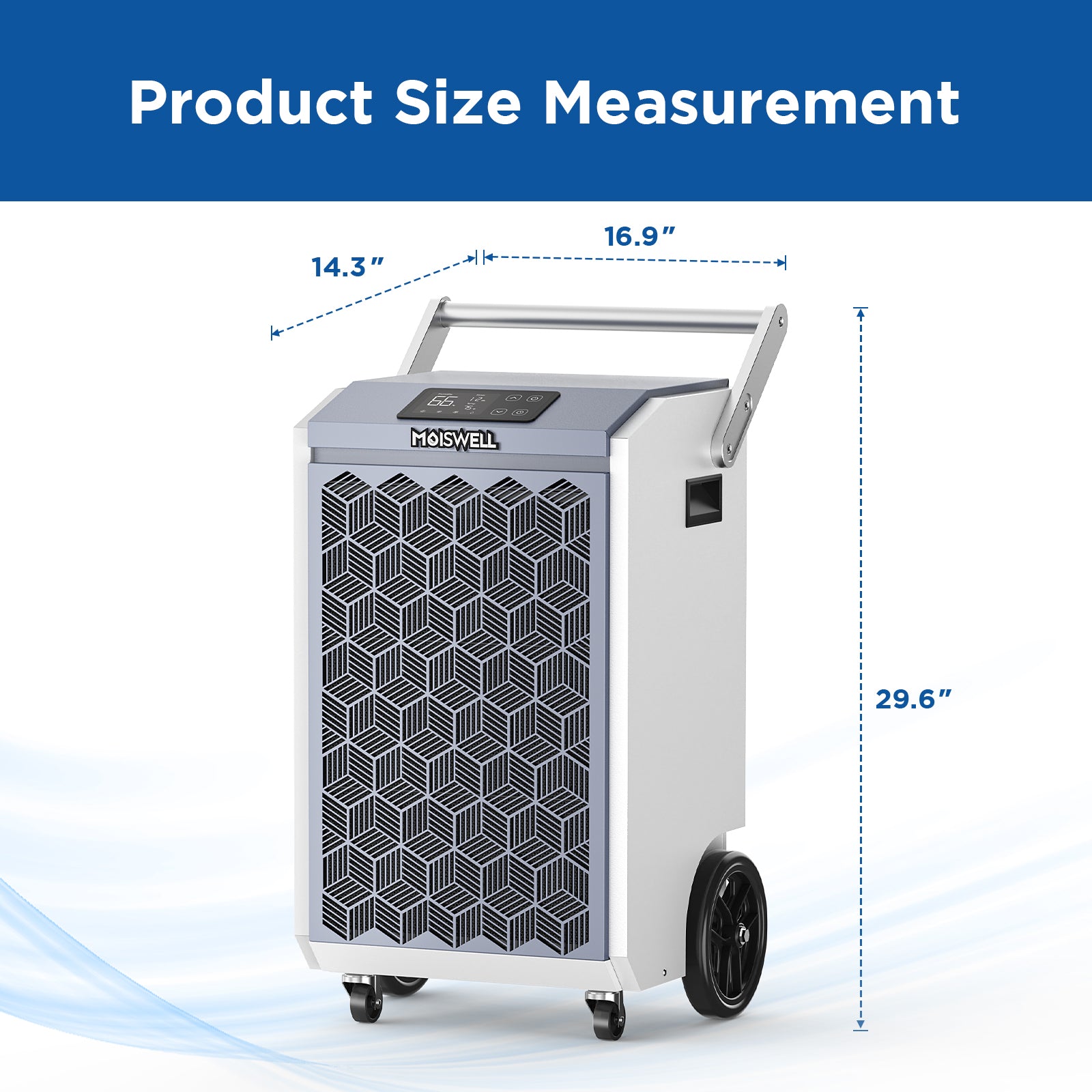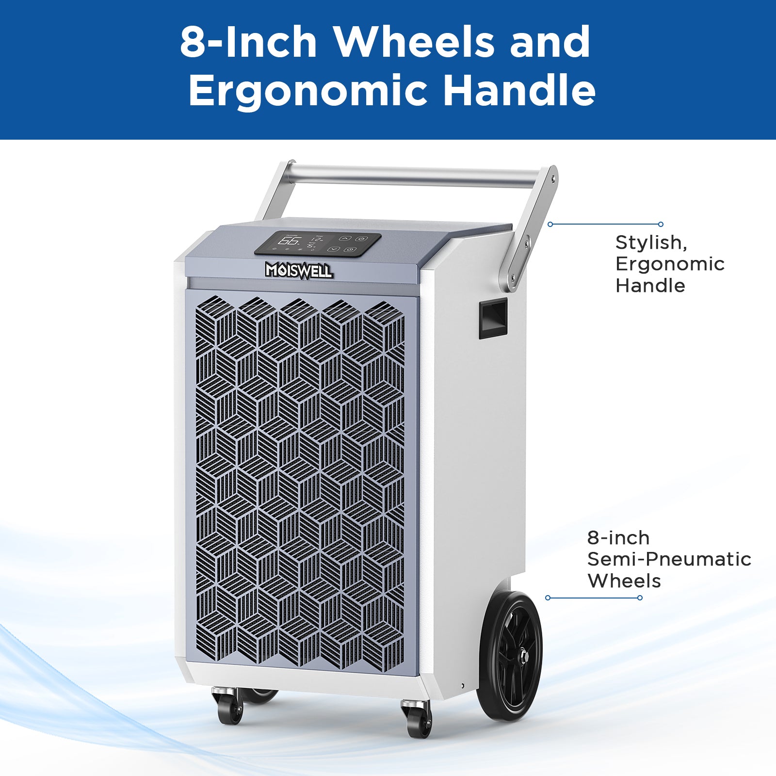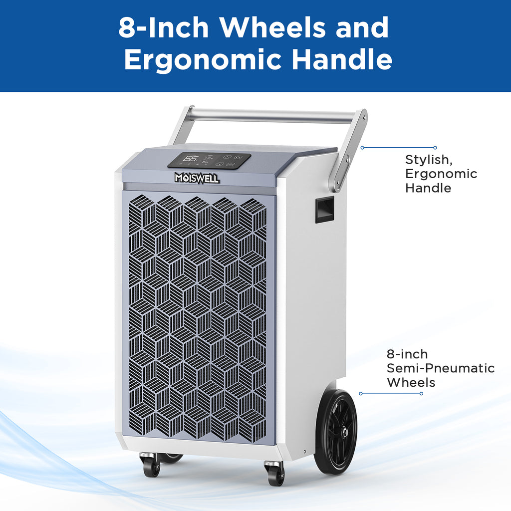 This large dehumidifier features 8-inch semi-pneumatic wheels for easy mobility and detachable handles for a firm grip and compact storage. Its design offers more convenience and portability than other small wheels, making it ideal for moving across different spaces effortlessly.
